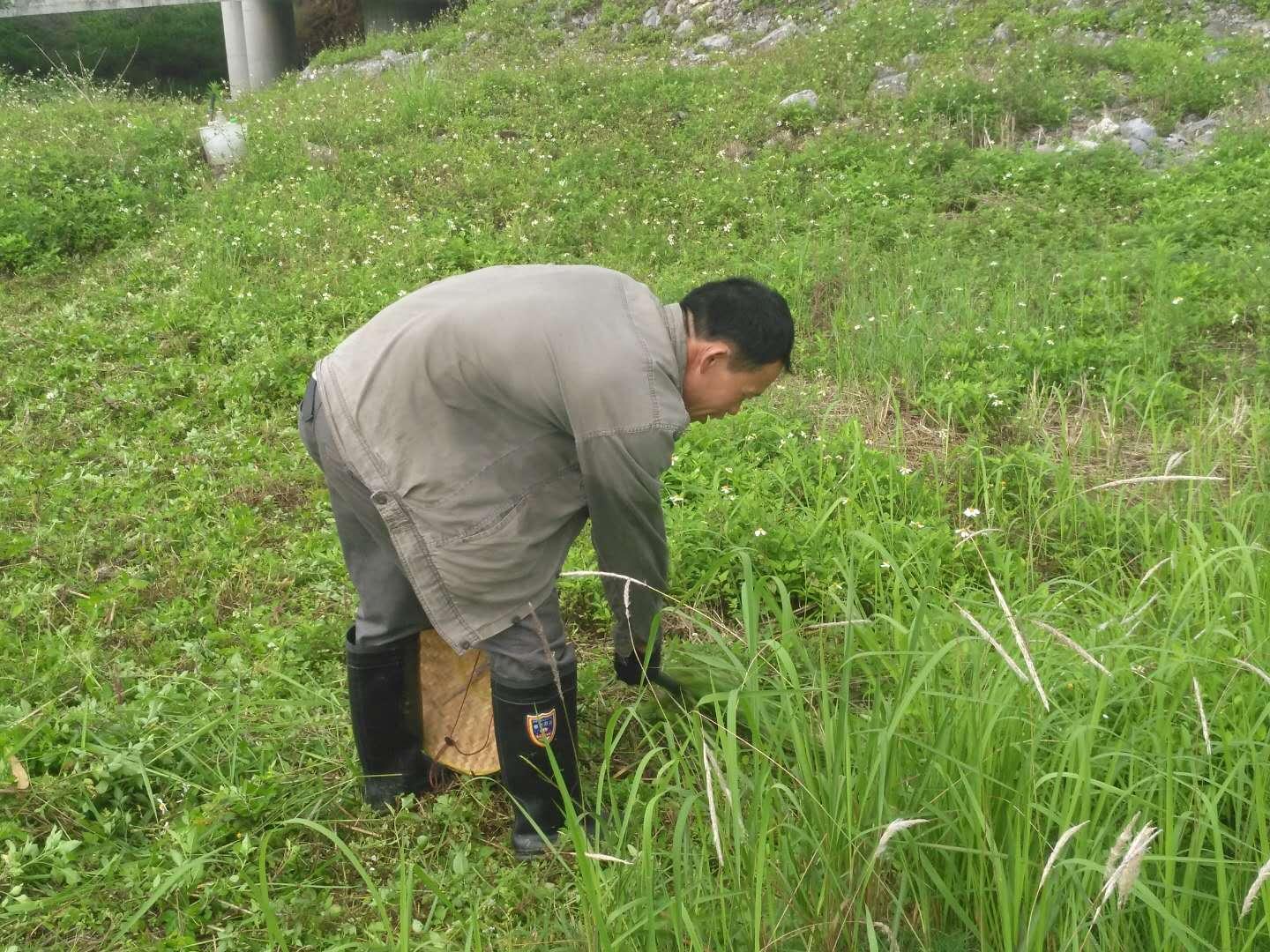 4月28日10时,正值阴天是除杂草的最好时机。莫师傅在使用除草机作业,梁师傅用镰刀在乱石堆上除草。靠近梁师傅,汗水湿透的他没停下手上活,一边介绍说,除草机也有10多斤重,背起来,手持电动刀一左一右地摇摆作业,开始是轻松,但作业久而久之也腰酸背痛的,必须轮换作业。有些地不平的、有石头的地方只能用老办法镰刀来付杂草。