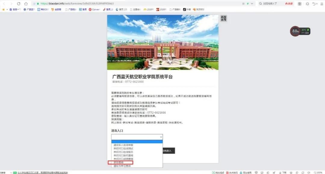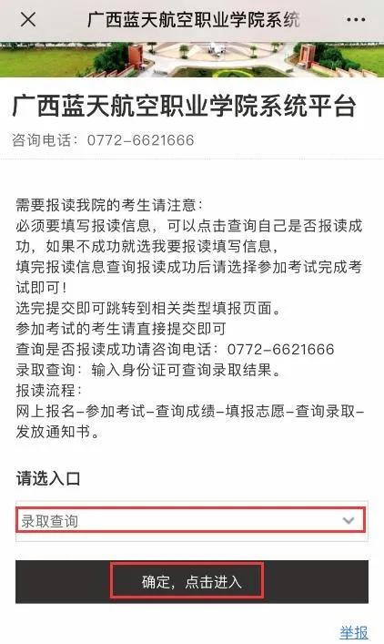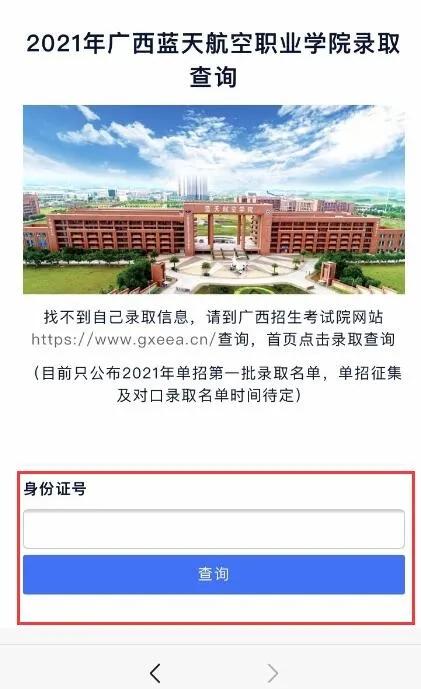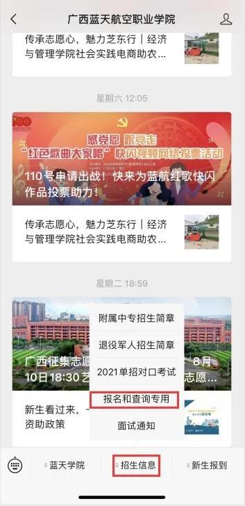 打开微信公众号搜索“广西蓝天航空职业学院”并关注公众号,点击菜单栏“招生信息”的子菜单:报名查询专用。
