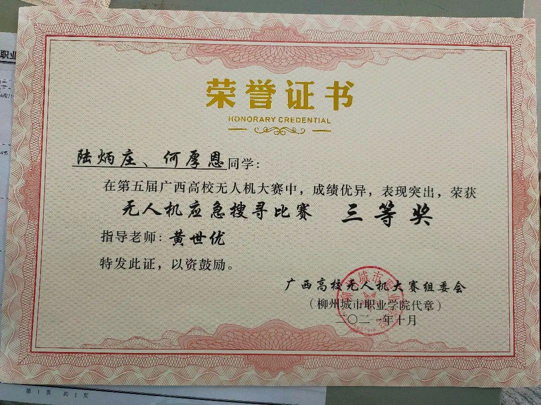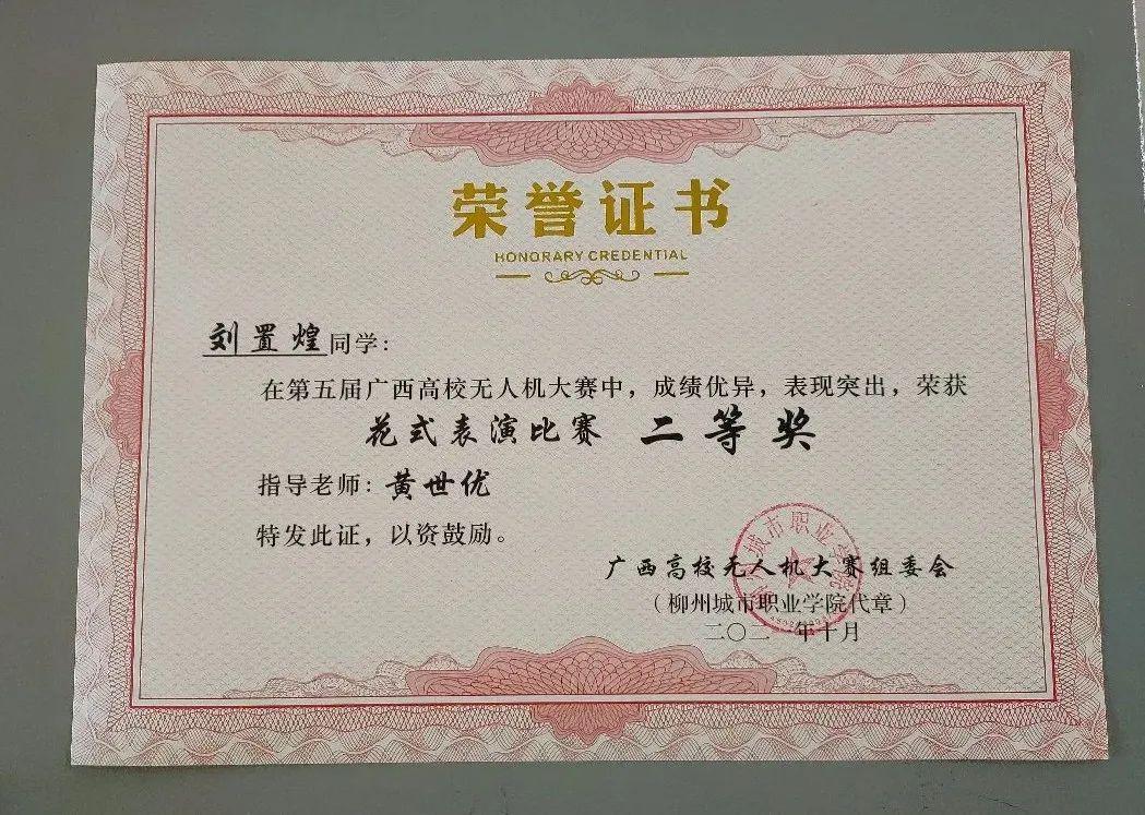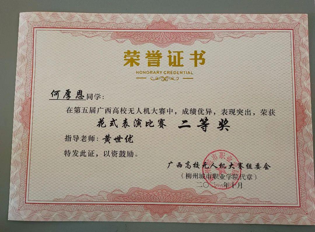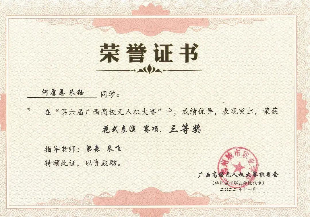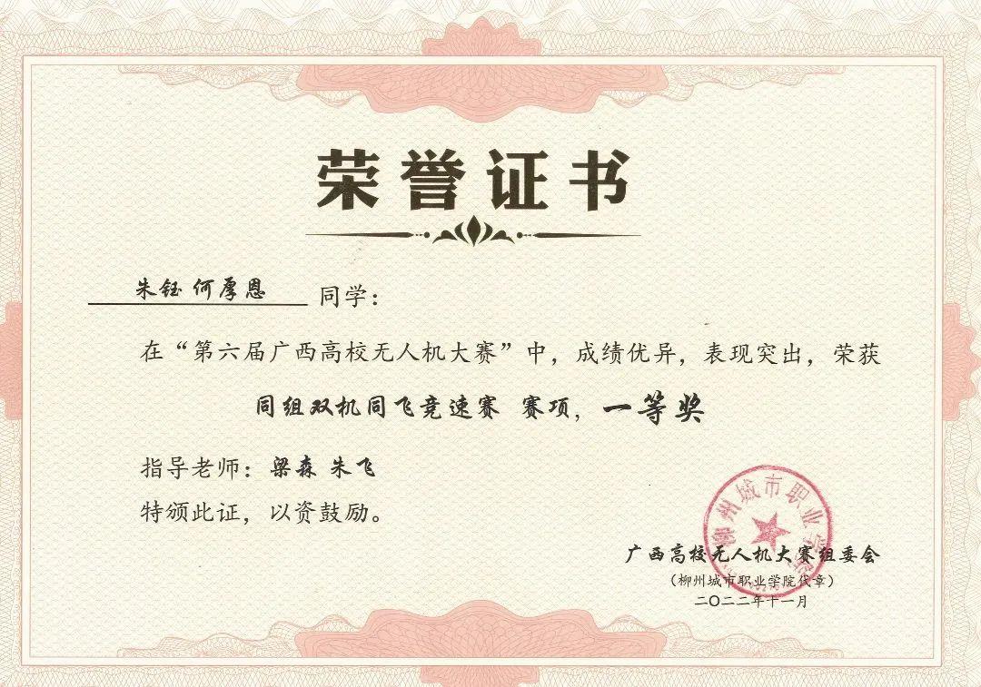 无人机学院在各项大赛屡获佳绩。2022年,朱飞、梁森老师指导学生参加“第六届广西高校无人机比赛”,在比赛项目中“同组双机同飞竞速”赛项获中斩获一等奖、二等奖,“花式表演”赛项获三等奖,梁森、朱飞获优秀指导教师。