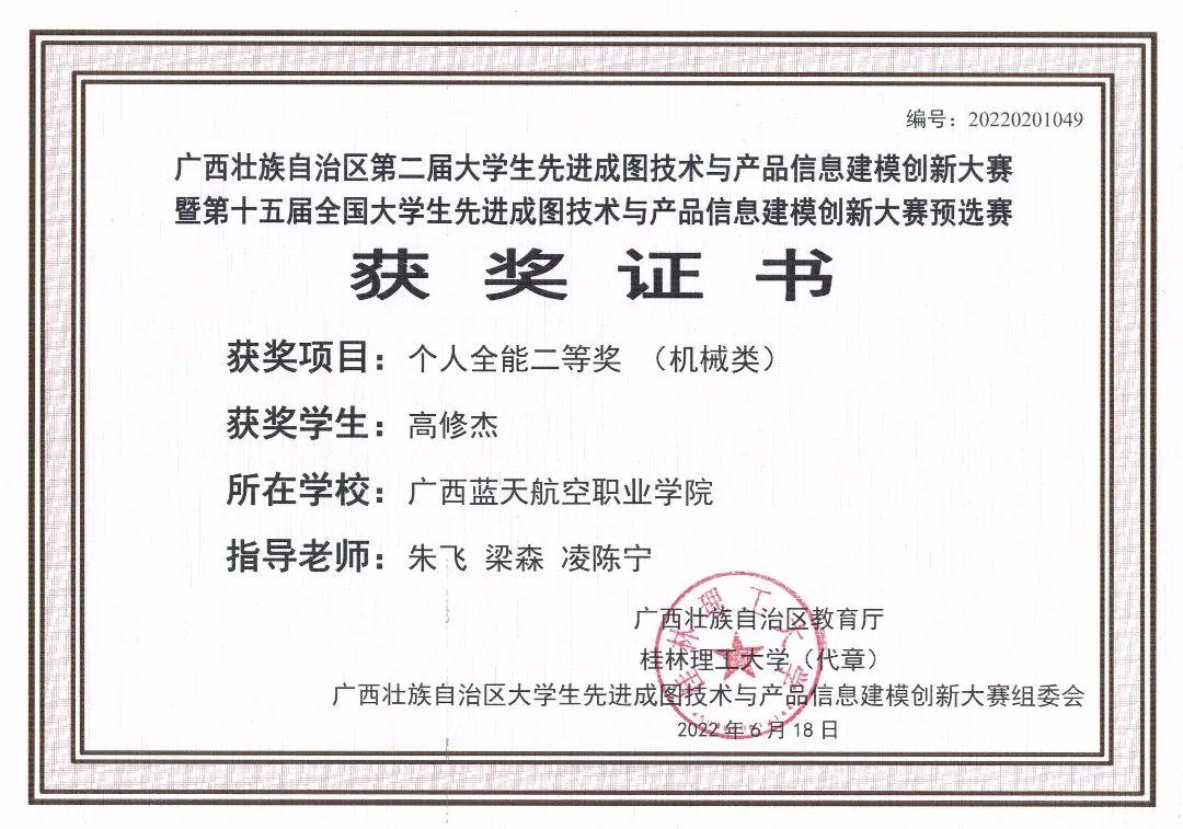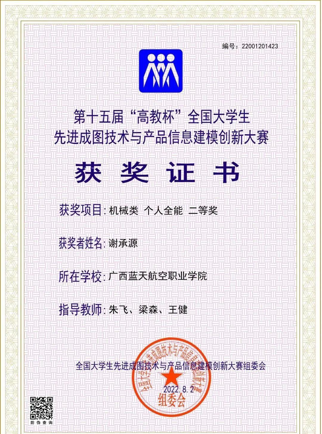 2022年8月,无人机学院组织学生参加“第十五届全国大学生先进成图技术与产品信息建模创新大赛”中,获得国家级个人全能二等奖1项、无人机轻量化设计团体三等奖,在省选拔赛也获二、三等奖。