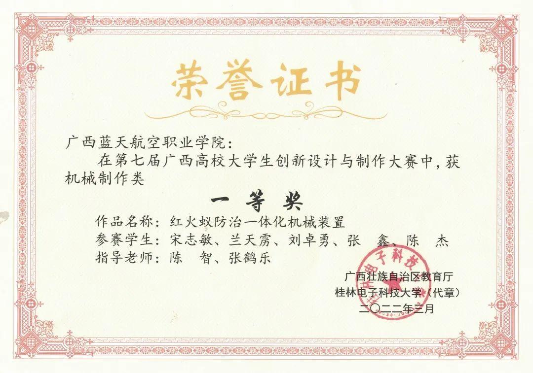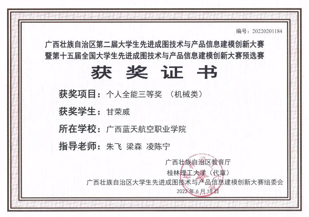 2022年3月,张鹤乐等老师培训学生参加第七届广西高校大学生机械创新设计与制作大赛获“一等奖”,2022年7月荣获第六届全国大学生工业设计大赛广西赛区“三等奖” 。2022年10月荣获第15届3D大赛全国三维数字化创新设计大赛广西赛区特等奖。2022年11月,朱飞老师带队学生参加“广西第二届职业技能大赛”中获得优胜奖1人。