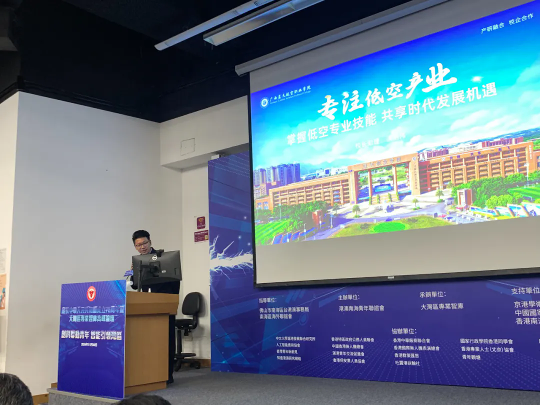 我校校长助理洪剑伟以《掌握低空专业技能 共享时代发展机遇》为题,从低空经济的概念、应用场景、利好政策、市场规模、就业前景、低空经济全景图等方面为在场来宾全方位介绍了低空经济的发展现状。并结合广西蓝天航空职业学院的发展情况、航空特色专业建设、产教融合协同育人等方面为在场青年们提供了参与低空经济的路径与人才培养建议。更是通过两个实际的案例为青年们生动地呈现了青年在低空经济发展中的机遇与成果。最后,他发出构建大湾区低空经济产业学院的倡议,助力大湾区低空经济的高质量发展。