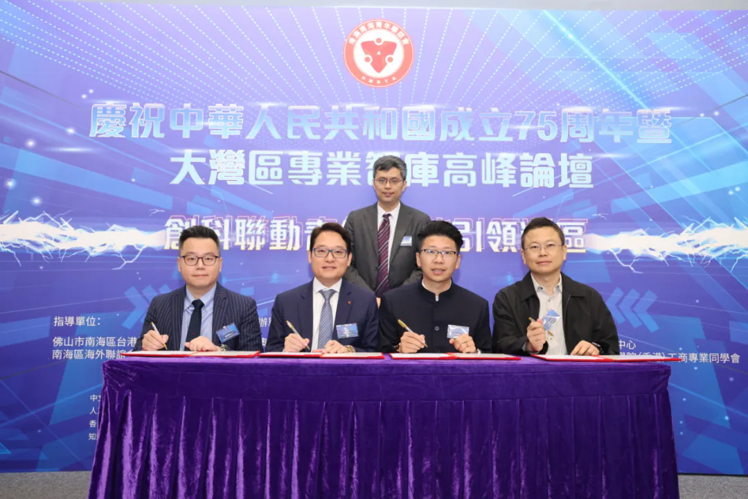 缔结大湾区低空经济战略合作备忘签署仪式。(左起)中国香港无人机总会低空经济发展委员会主席温伟麟先生,大湾区专业智库召集人关建基测量师,广西蓝天航空职业学院校长助理洪剑伟先生,港澳南海青年联谊会副理事长张永鸿先生