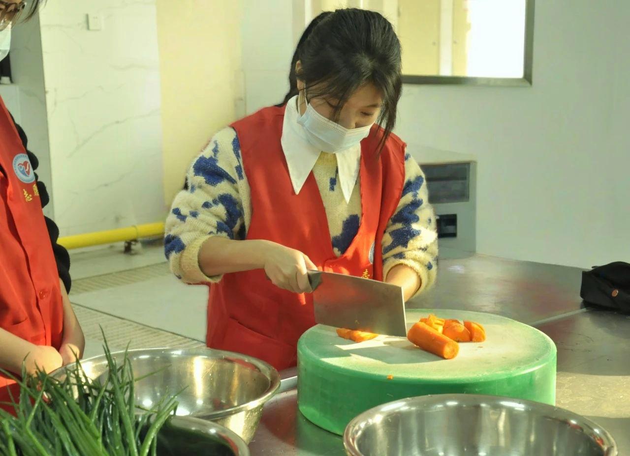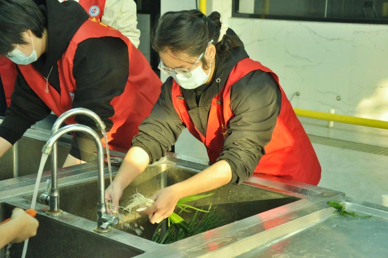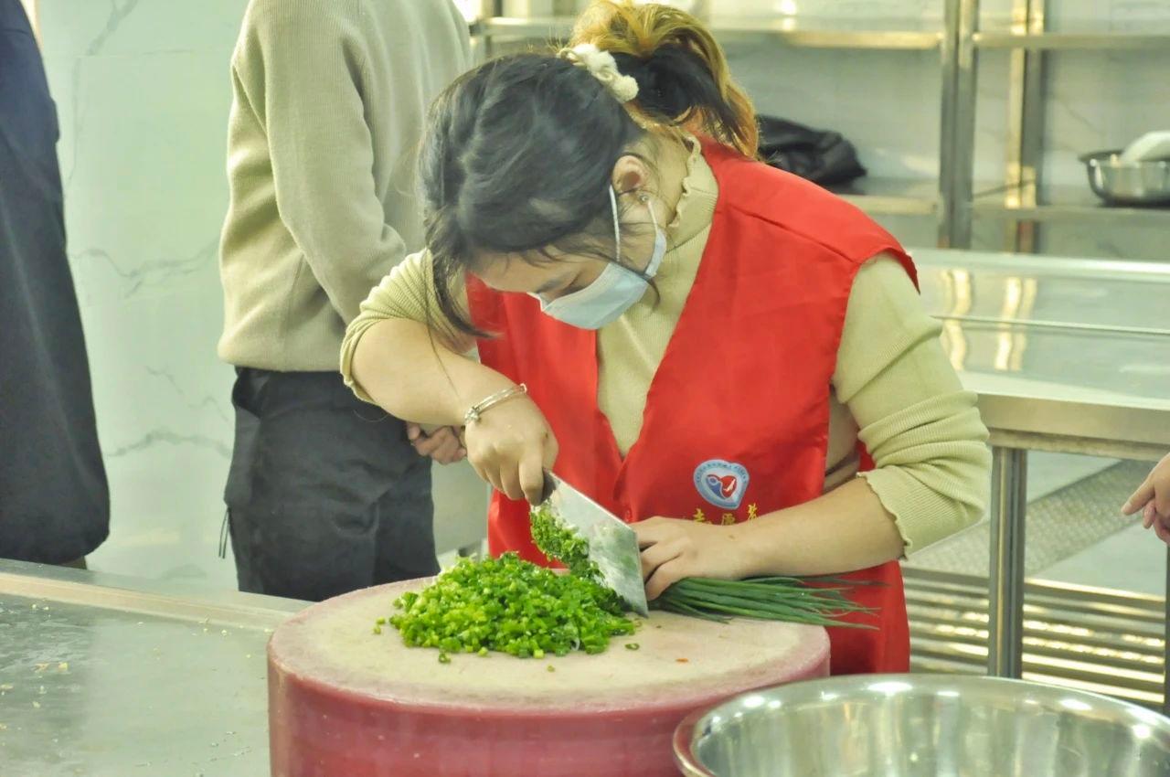 在食堂阿姨和师傅的悉心指导下,同学们热情高涨、各展身手。有的忙着淘洗食材,有的则熟练地挥舞着菜刀,将食材切得细碎均匀,为调制馅料做准备。