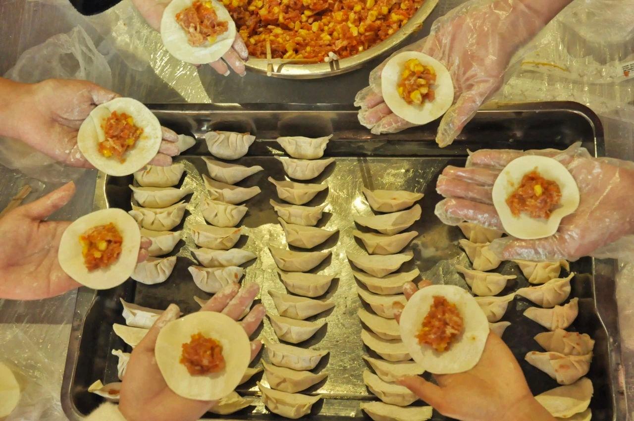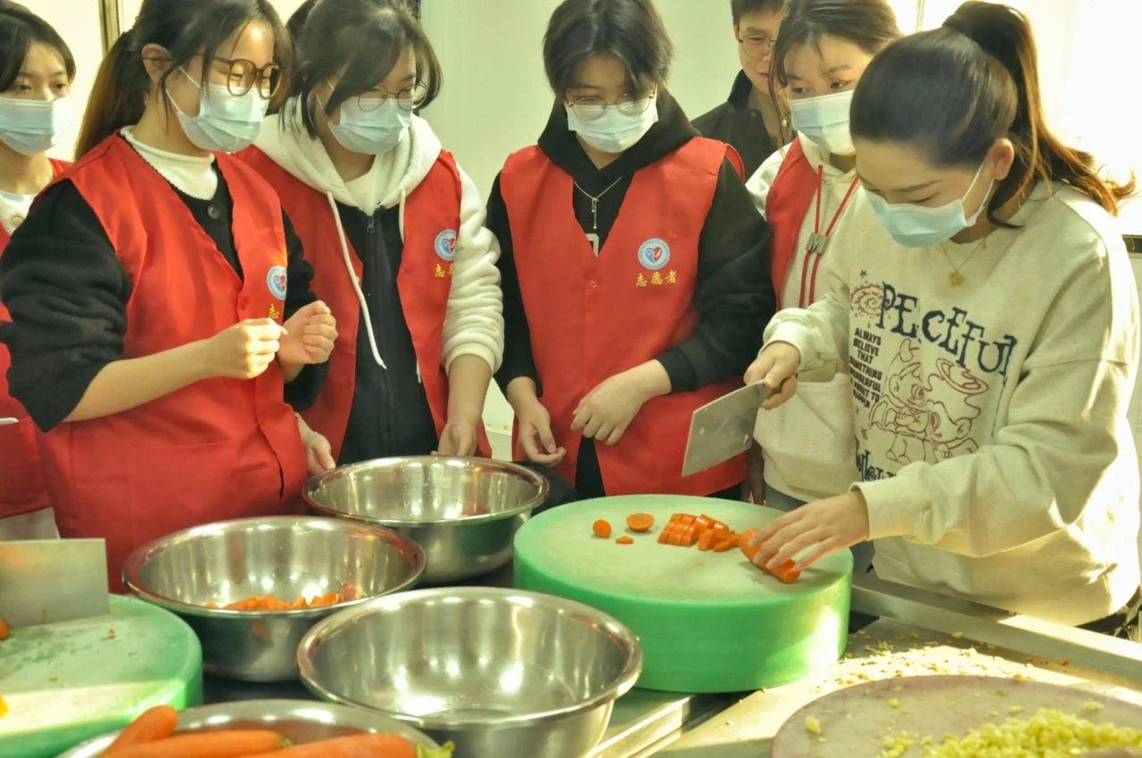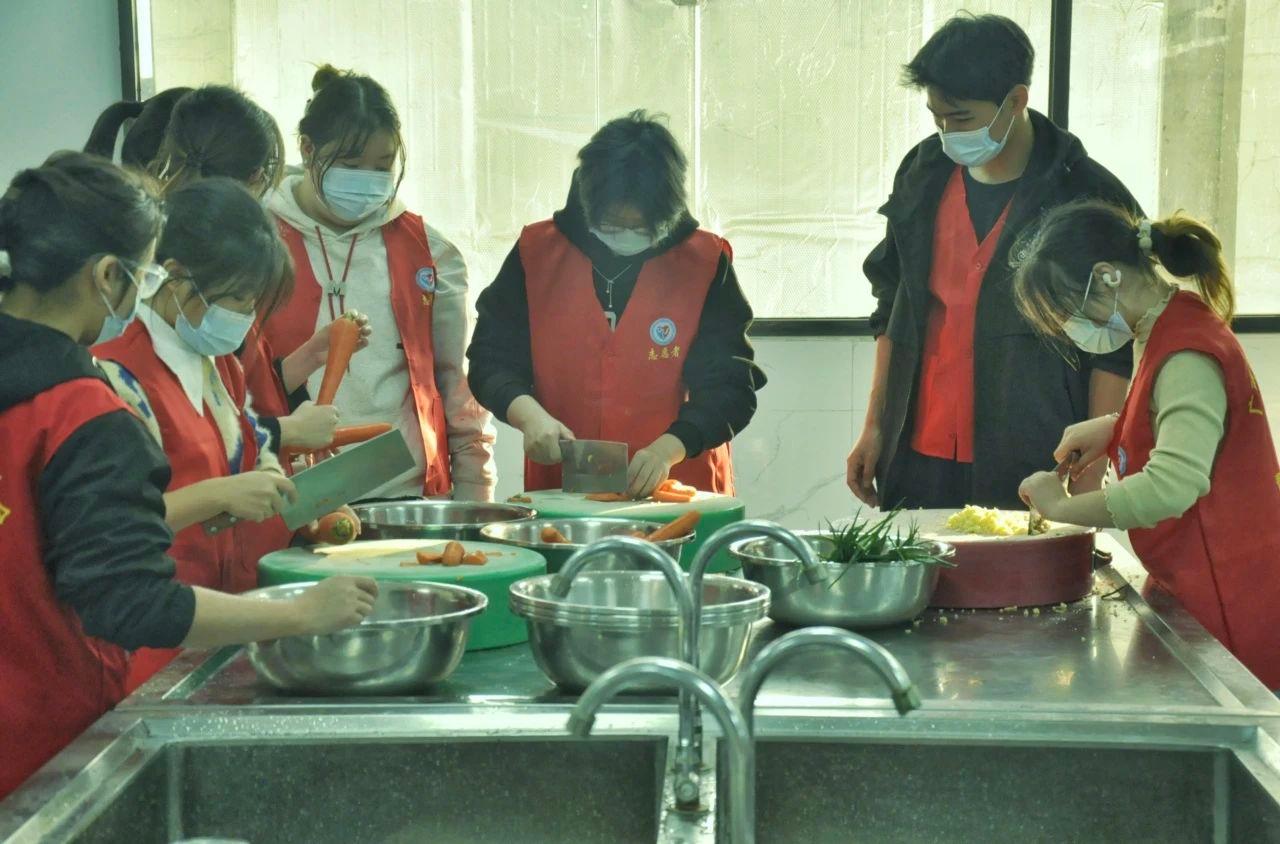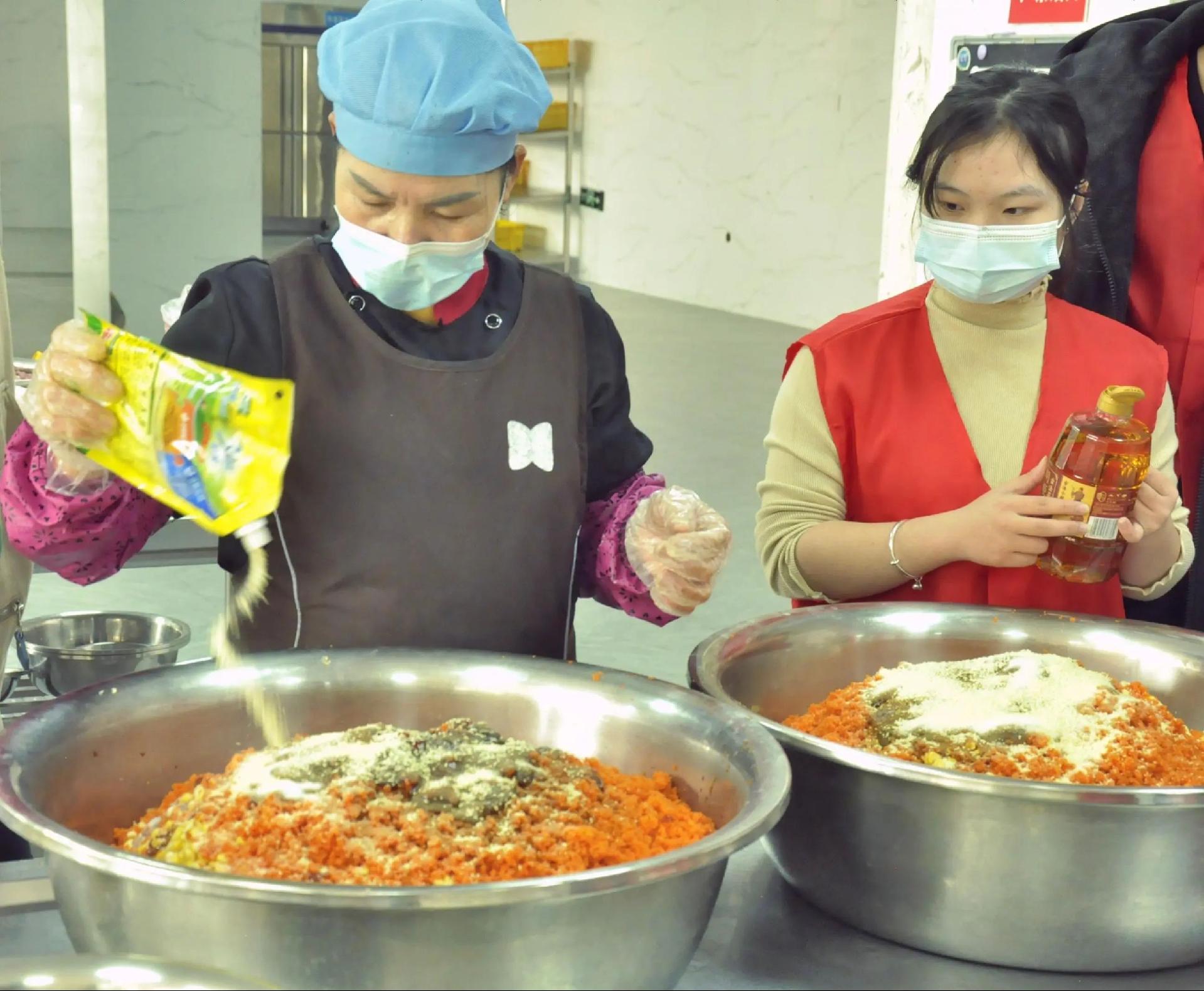 在食堂阿姨和师傅的悉心指导下,同学们热情高涨、各展身手。有的忙着淘洗食材,有的则熟练地挥舞着菜刀,将食材切得细碎均匀,为调制馅料做准备。