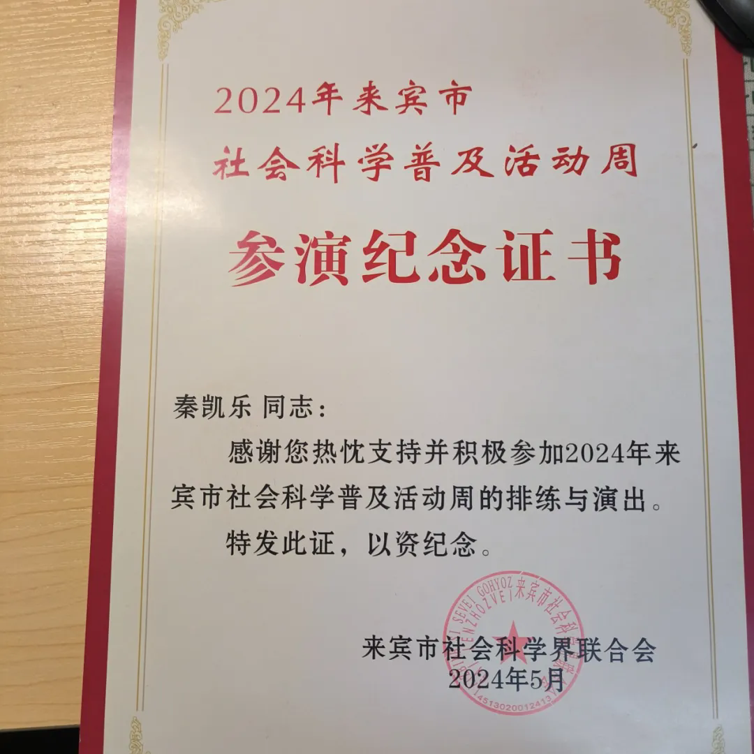 青春是一场迎风破浪的无畏前行,在大学的美好时光里,秦凯乐同学时刻不忘专业学习的重要性,他没有辜负老师对他的期望,刻苦努力获得专业课年级排名第二的优异成绩,还荣获了学习优秀二等奖学金、优秀学生干部、2023-2024年度“宣传积极分子”等荣誉称号。他并没有因为这些荣誉光环而骄傲,而是静下心来沉淀自己,时刻谨记践行新时代大学生肩负的使命担当,他在2024来宾市红十字国际志愿者演艺活动、2024年来宾市社会科学普及活动周上,积极为社会公益贡献青春力量。