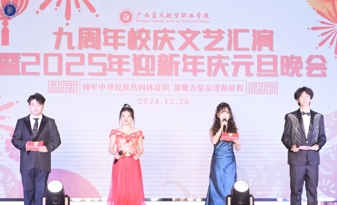 秦凯乐同学(右一)主持九周年校庆文艺汇演暨2025年迎新年庆元旦晚会