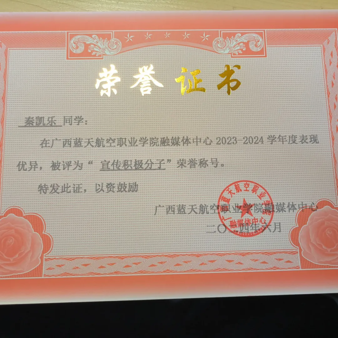 在校期间,秦凯乐同学还担任了新媒体中心副主编一职,他兢兢业业,用自己的努力和付出为新媒体中心注入了青春活力,多次在学校各类宣传片中出镜参演以及担任学校宣传主播,助力学校宣传工作。他也因此获得了2023-2024年度“宣传积极分子”的荣誉称号。