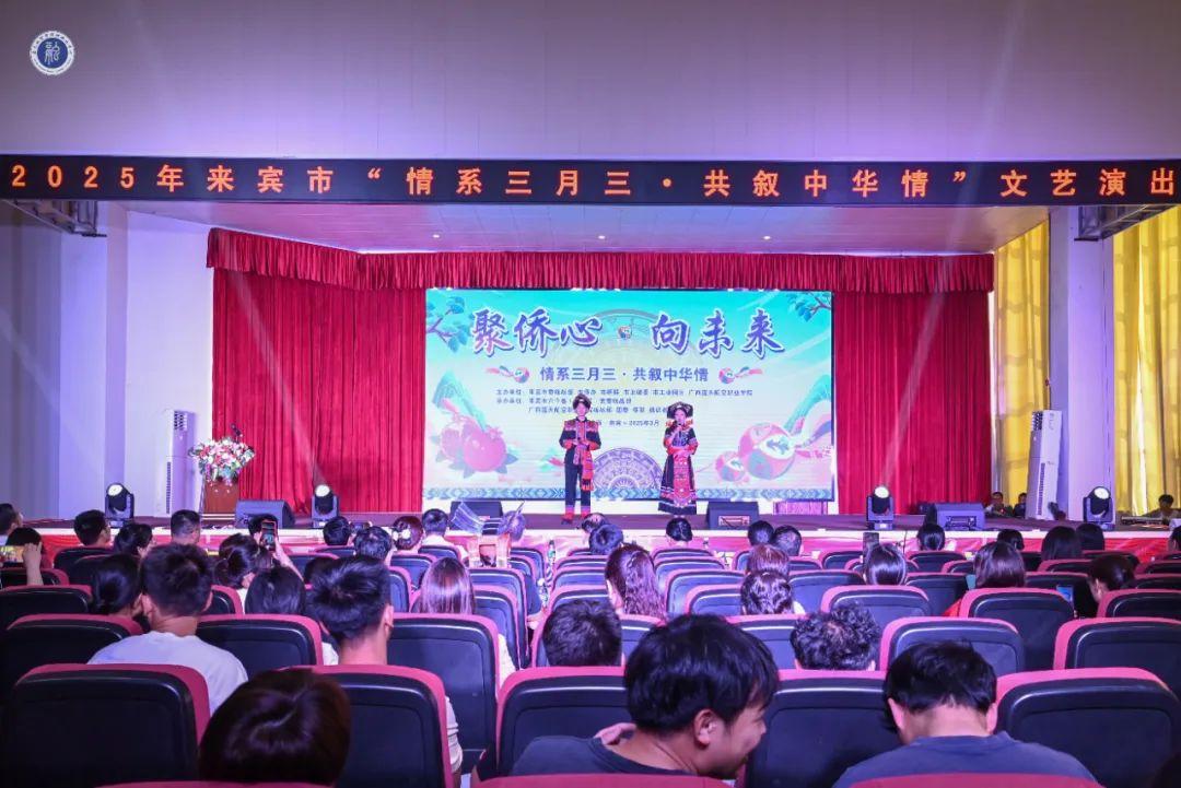百花俏枝头,处处歌如潮。3月27日下午,一场以“聚侨心·向未来”为主题的2025年来宾市“情系三月三·共叙中华情”活动在我校举办。本次活动由来宾市委统战部、市侨办、市侨联、市卫健委、市工业园区、广西蓝天航空职业学院联合举办。自治区党委统战部副部长陈洁,自治区侨联党组成员、副主席宋宁,来宾市委常委、统战部部长林志华,市政协副主席、市侨联主席林万顺,自治区党委统战部侨务综合处副处长刘苗苗,市委统战部副部长、市社会主义学院党组书记、市侨办主任、市台办主任韦团,市侨联副主席潘爱华,市卫健委副主任邓斌,市工业园区党工委副书记黄维春,广西蓝天航空职业学院执行副校长鲁明,党委副书记、政府督导专员秦樟连,副校长刘小飞, 来宾市6个县(市、区)党委统战部部长、广西蓝天航空职业学院相关领导、归侨侨眷代表以及师生代表1000多人参加活动。来宾市委常委、统战部部长林志华为活动致辞,自治区党委统战部副部长陈洁作讲话。