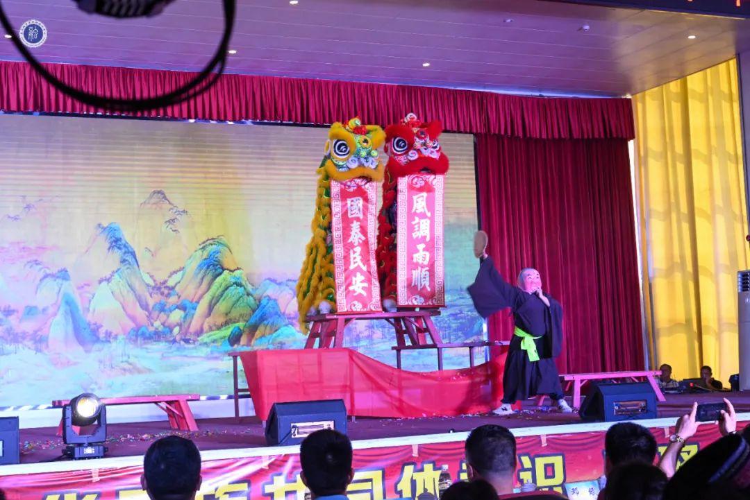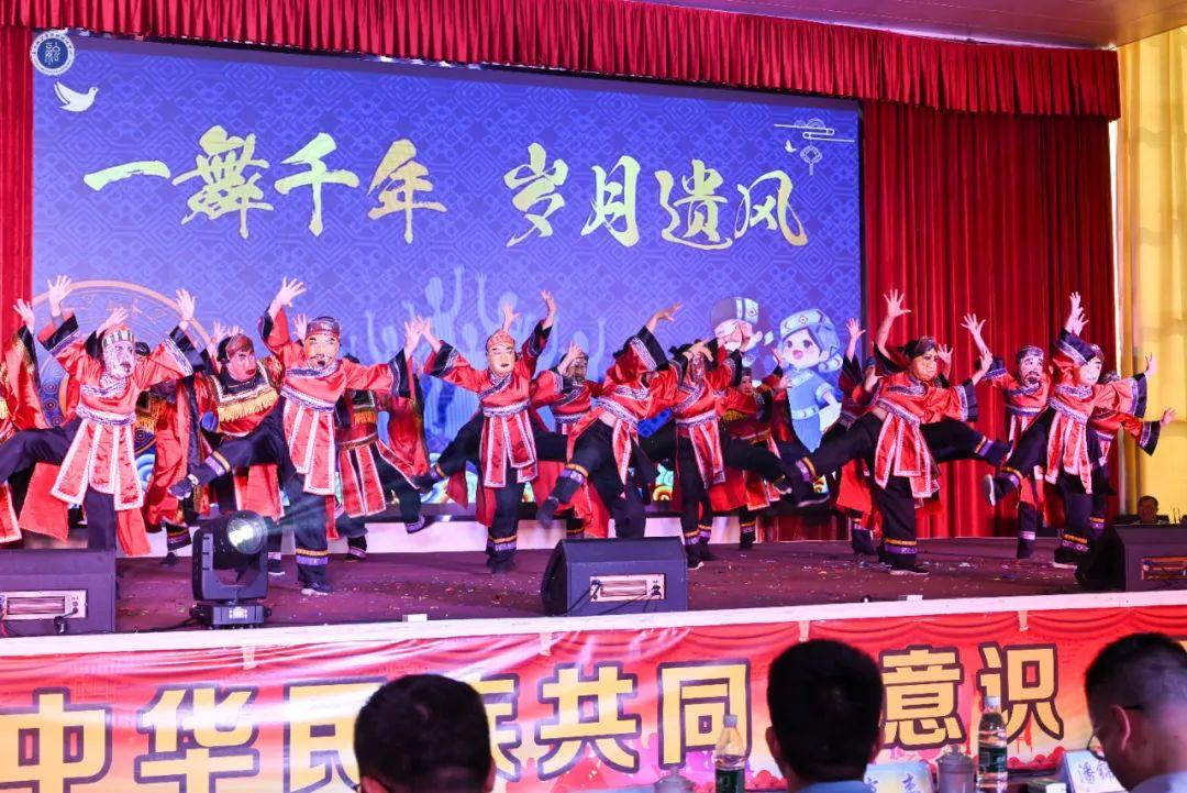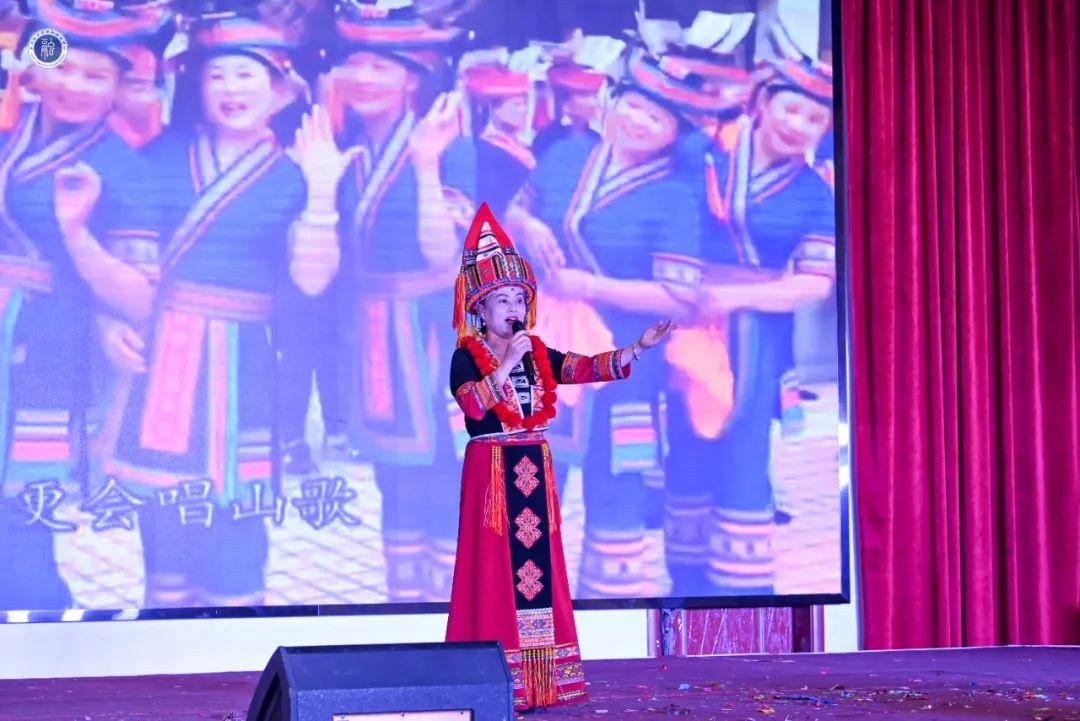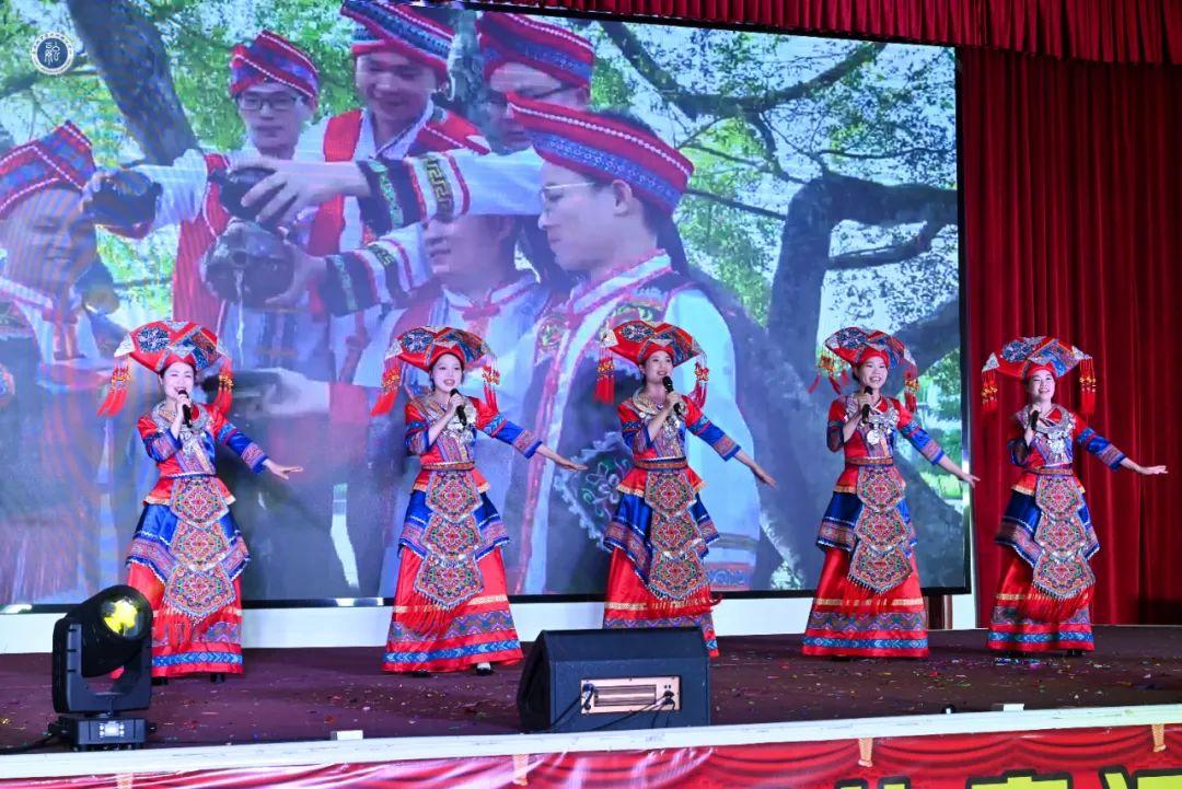 文艺表演中,我校携手象州县城东民乐艺术团、来宾市工业园区、来宾市各县(市、区)统战部以醒狮、歌舞、非遗展演等多元形式打造视听盛宴,13个精彩纷呈节目轮番登场,从激昂鼓乐到锦绣华服,传统与现代艺术在绚丽舞台碰撞,共谱民族团结华章。铿锵锣鼓声中,醒狮表演《狮耀九州,国泰民安》率先点燃全场,金狮踏桩起舞,展现非遗绝技; 民族服饰秀《桂巳锦绣》演绎千年服饰之美;壮族非遗《师公舞》携神秘傩面登场,古朴舞步与音乐交织,再现千年祭祀场景;《九州同》以长扇翩跹勾勒山河共美画卷;《民族团结花盛开》将"同心共筑中国梦"的推向高潮……身着盛装的演员们以歌舞传情,生动展现了“三月三”的独特魅力。