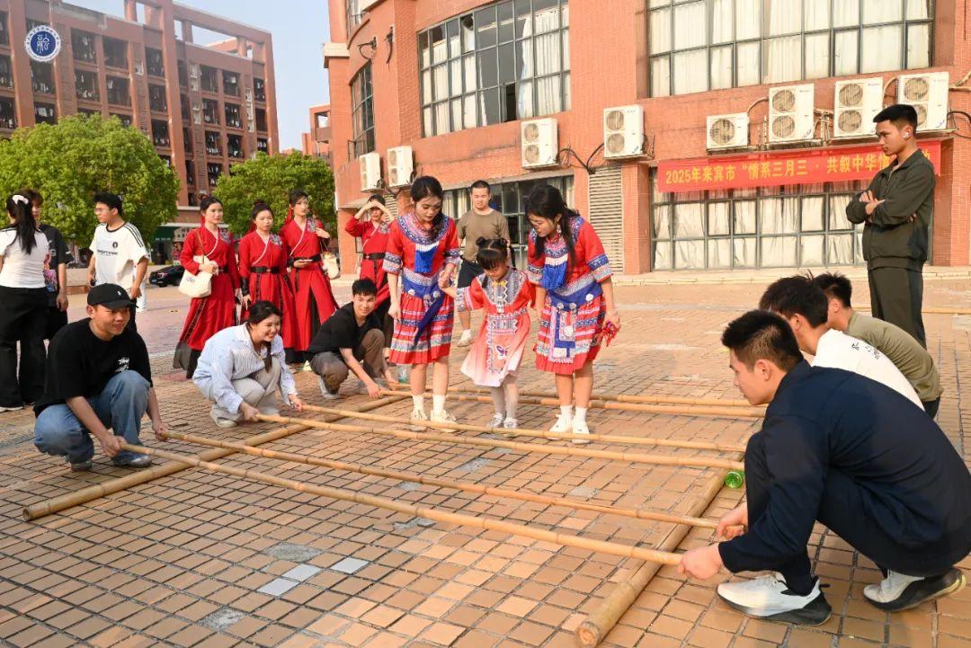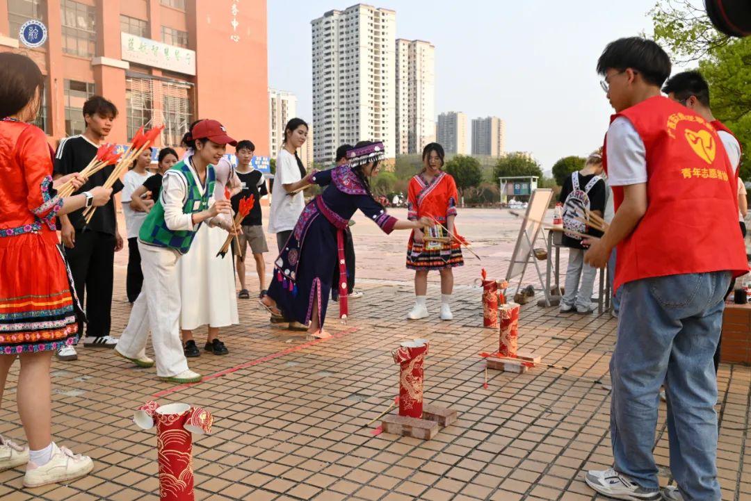 民族游戏互动环节,抛绣球、竹竿舞、投壶、滚铁圈、踢毽子等传统民族游戏吸引众多师生踊跃参与。大家分组协作,在欢快的节奏中,尽情享受游戏乐趣,现场欢声笑语不断。在体验民族文化的同时,也增进了彼此间的情谊。